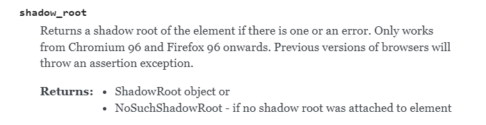 Plus, Selenium has provided the shadow_root() function to give user’s the identify the shadow DOM